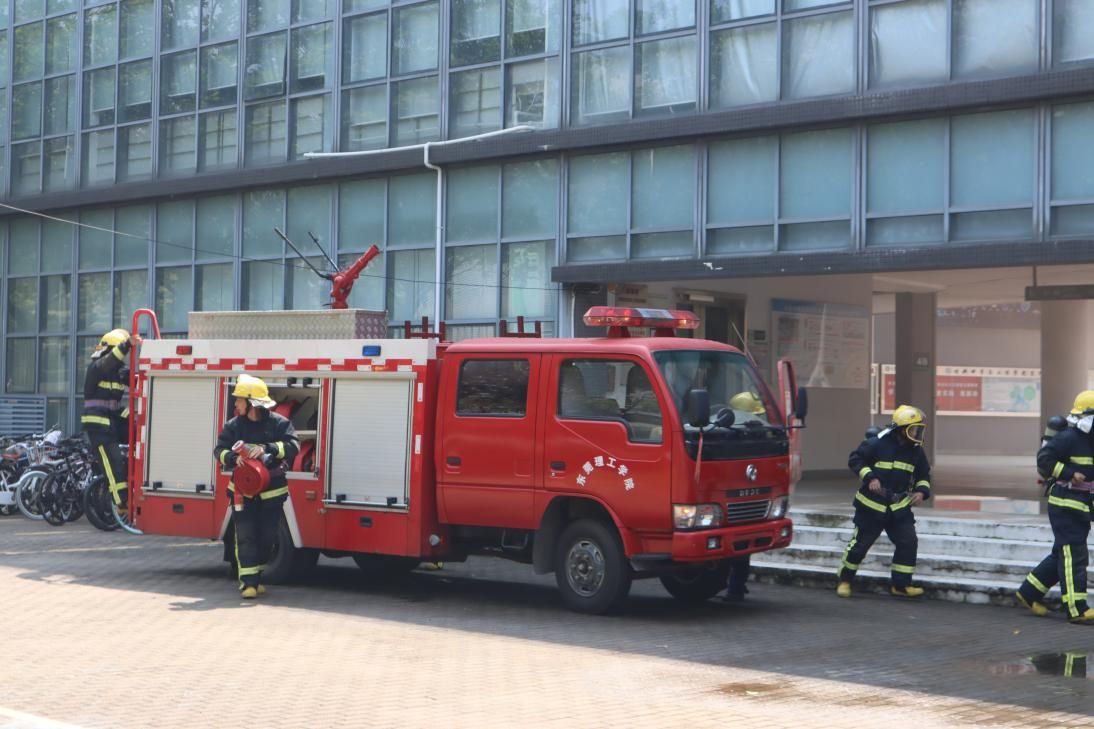随后消防车入场,学校微型消防站志愿消防队队员开展搜救并控制、扑灭火情。