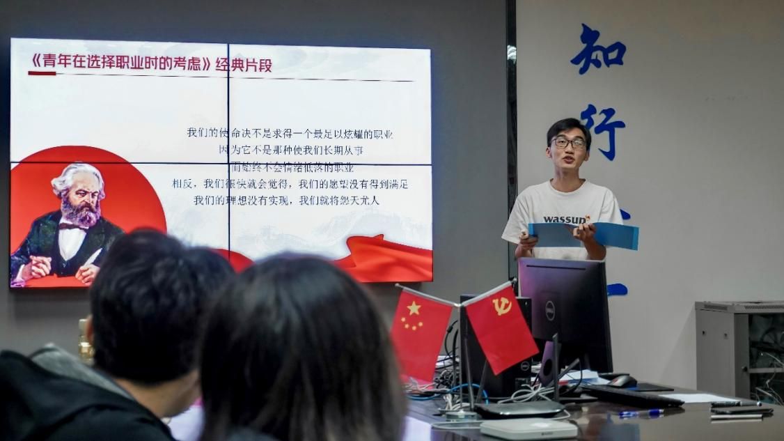 首先,支部书记苏朗介绍了写作背景和主要内容。该文章是马克思于1835年8月在德国特里尔中学写下的中学毕业论文。阅卷老师批阅后,评论道:“思想丰富,精彩有力,值得赞许。”校长威登巴赫读后也赞扬:“此文以思想丰富和结构严谨而引人注目。”马克思在这样一个充满梦想和希望的季节,对自己的人生、未来进行了深入的思考、规划和设计。文中,17岁的马克思重点论述了“青年为什么要选择职业、如何选择职业、应该选择什么样的职业”这三大核心问题,清晰明确、坚定有力地阐明了自己的就业价值观。在文章的最后,马克思为他自身的职业选择做了激情的宣告:要为人类的幸福献身。