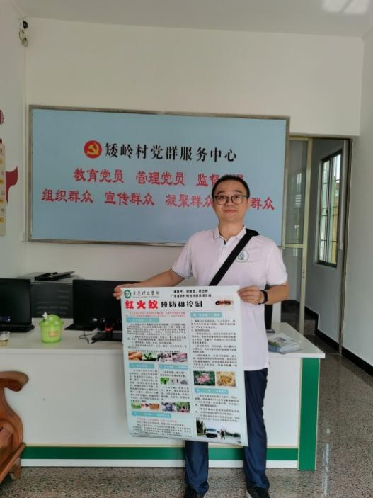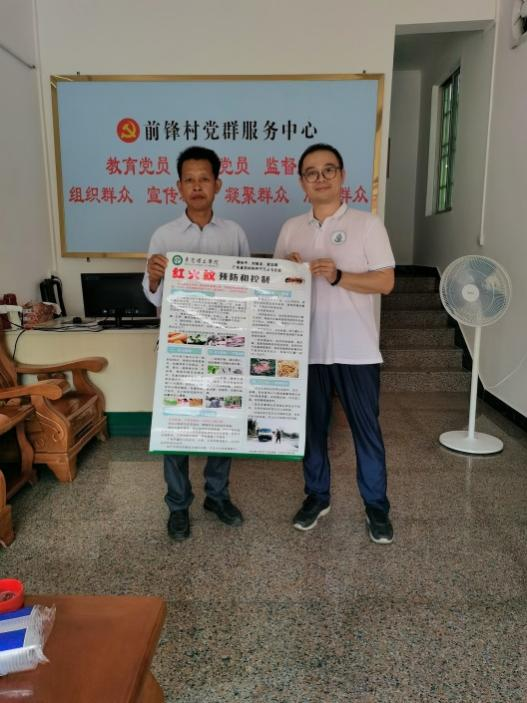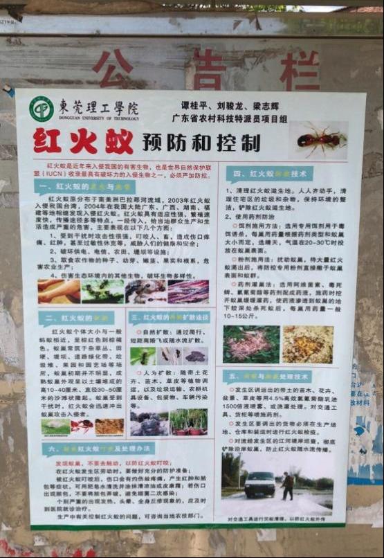 2021年10月3日至5日期间,巨乳美女 的广东省农村科技特派员谭桂平博士,到对接的云浮市云城区前锋镇前锋村、矮岭村和思劳镇云贡村,开展红火蚁防治知识宣传,并向各村委负责人赠送宣传海报共计70份。这些海报被贴在各自然村以及学校的宣传栏,起到很好的宣传教育效果。