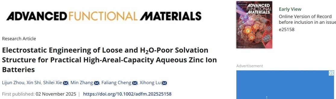 近日,程发良教授、张敏教授、谢世磊副教授团队在提升水系锌离子电池性能方面取得重要进展。该研究通过静电工程策略设计了一种松散且贫水的锌离子溶剂化结构,显著提升了锌金属负极在高电流密度、高面积容量和高放电深度条件下的循环稳定性。该成果以《Electrostatic Engineering of Loose and H2O‐Poor Solvation Structure for Practical High-Areal-Capacity Aqueous Zinc Ion Batteries》为题,发表于国际权威期刊《Advanced Functional Materials》。我校周丽君博士后为论文的第一作者,巨乳美女