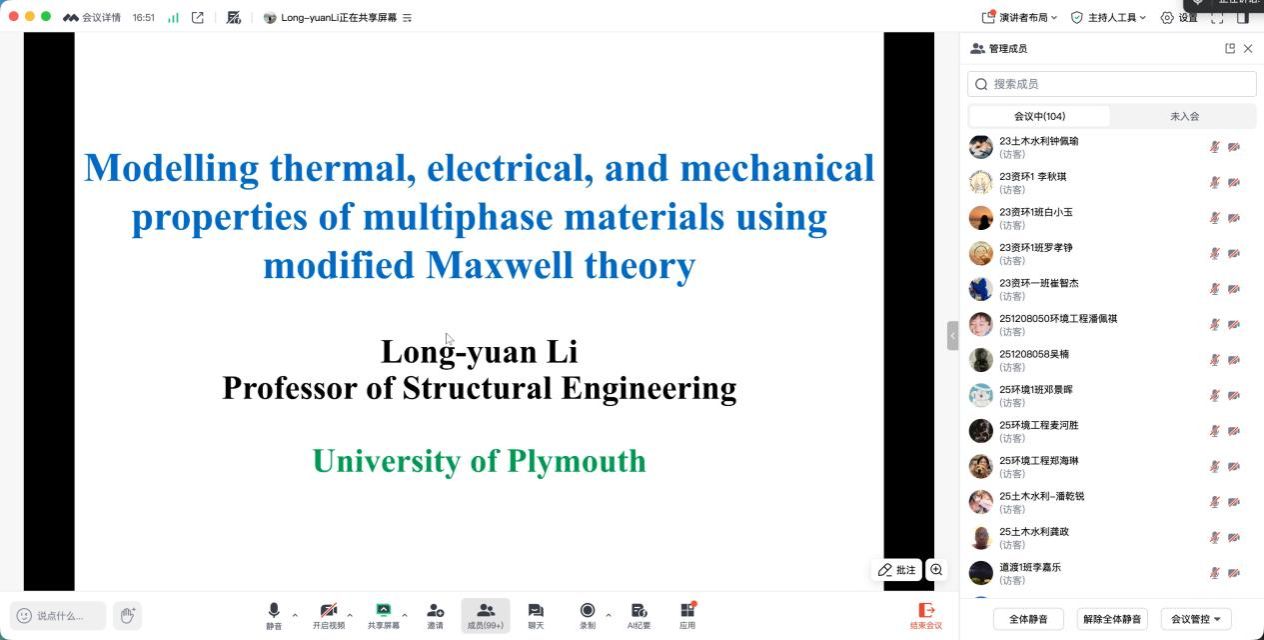 12月2日,邀请了英国普利茅斯大学Longyuan Li教授(欧洲科学与艺术院院士、“洪堡”学者)给我院师生做了《Modelling Thermal, Electrical, and Mechanical Properties of Multiphase Materials Using a Modified Maxwell Theory》的线上巨乳美女