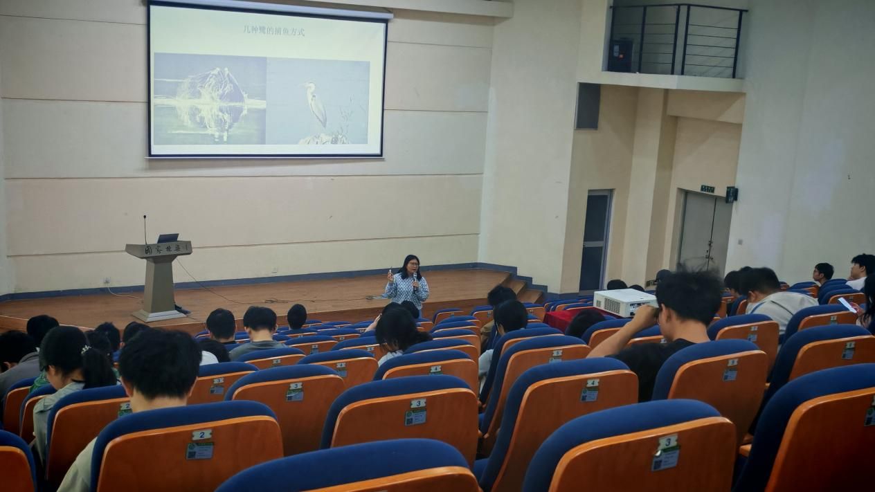 的李翠丹老师以《莞工鸟儿的那些事儿》为主题展开科普宣讲。李老师从鸟类分类知识切入,用生动形象的语言介绍了校园内常见鸟类的外形特征、生活习性,分享了它们鲜为人知的趣味故事——从清晨林间穿梭的麻雀、湖面嬉戏的白鹭,到偶尔驻足的翠鸟,一个个鲜活的案例让同学们发现,原来身边的“飞羽邻居”藏着这么多奥秘。更具深意的是,李老师将鸟类科普与生态保护理念紧密结合,强调湿地作为鸟类重要栖息地的核心价值,提出“守护鸟类家园,始于低碳生活”的理念,引导同学们认识到:减少塑料使用、做好垃圾分类、践行低碳出行,这些看似微小的校园日常,都是在为鸟类守护家园、为湿地保护助力,让“无废校园”建设与鸟类保护形成良性互动。
