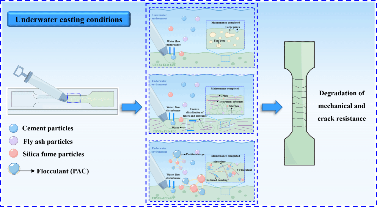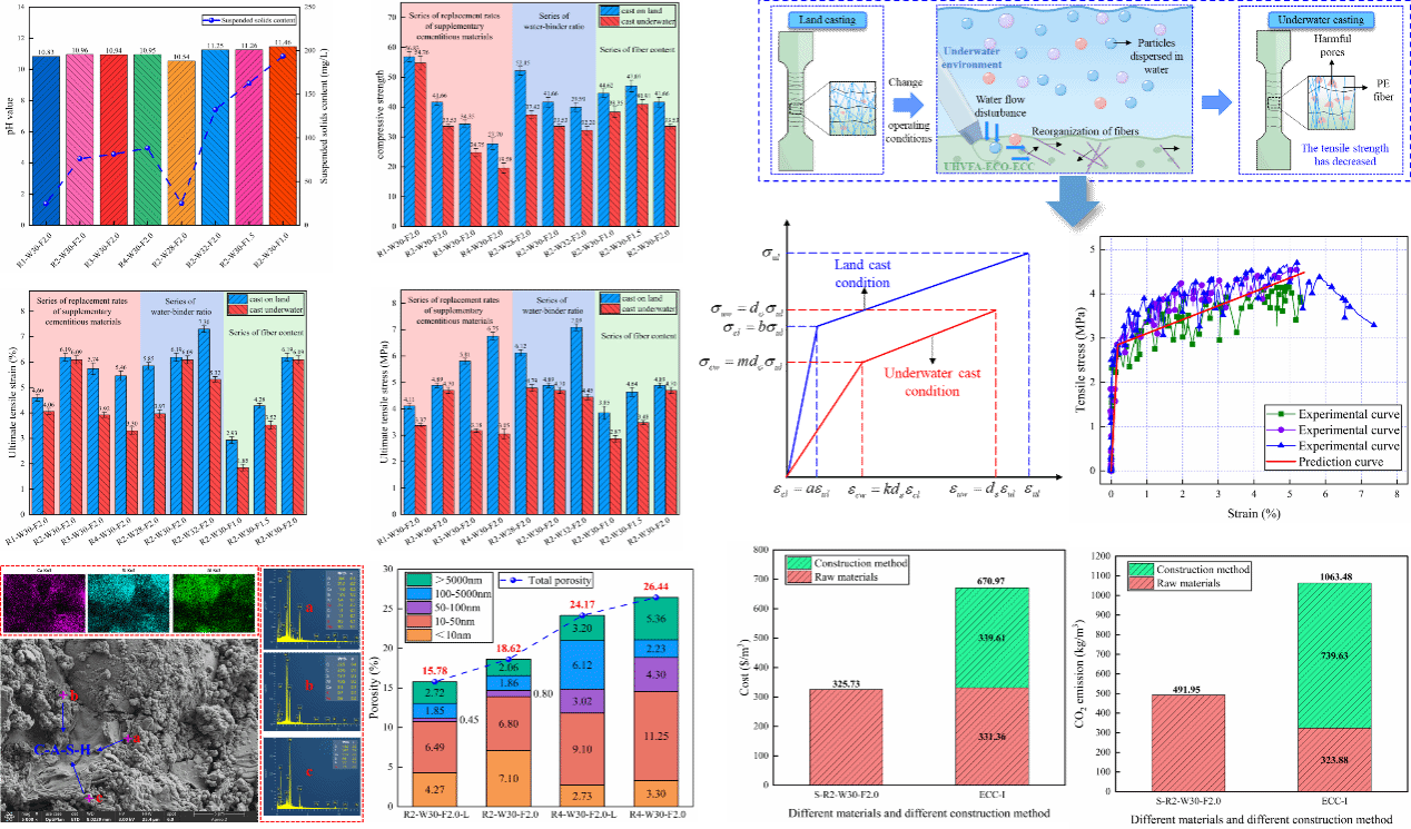 图2. 水下浇筑工况下 UHVFA-ECO-ECC 多尺度性能与力学退化模型:试验数据、微观机理、力学性能退化机理与模型、经济与环境评估分析